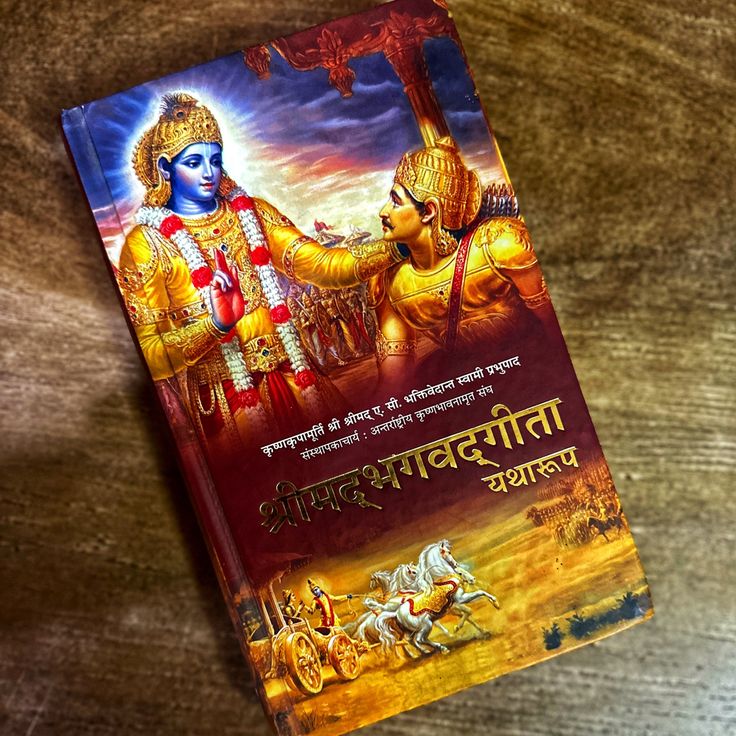 Hardcover Bhagavad Gita with Sanskrit text, Hindi translation, and commentary.
