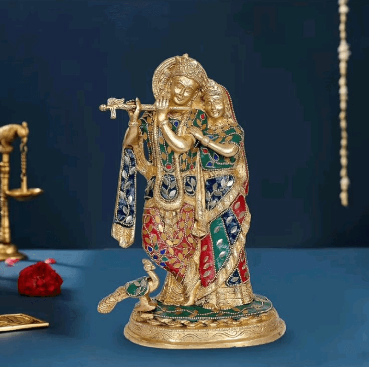 Handcrafted brass idol of Radhakrishna playing the flute. Perfect for your home temple.